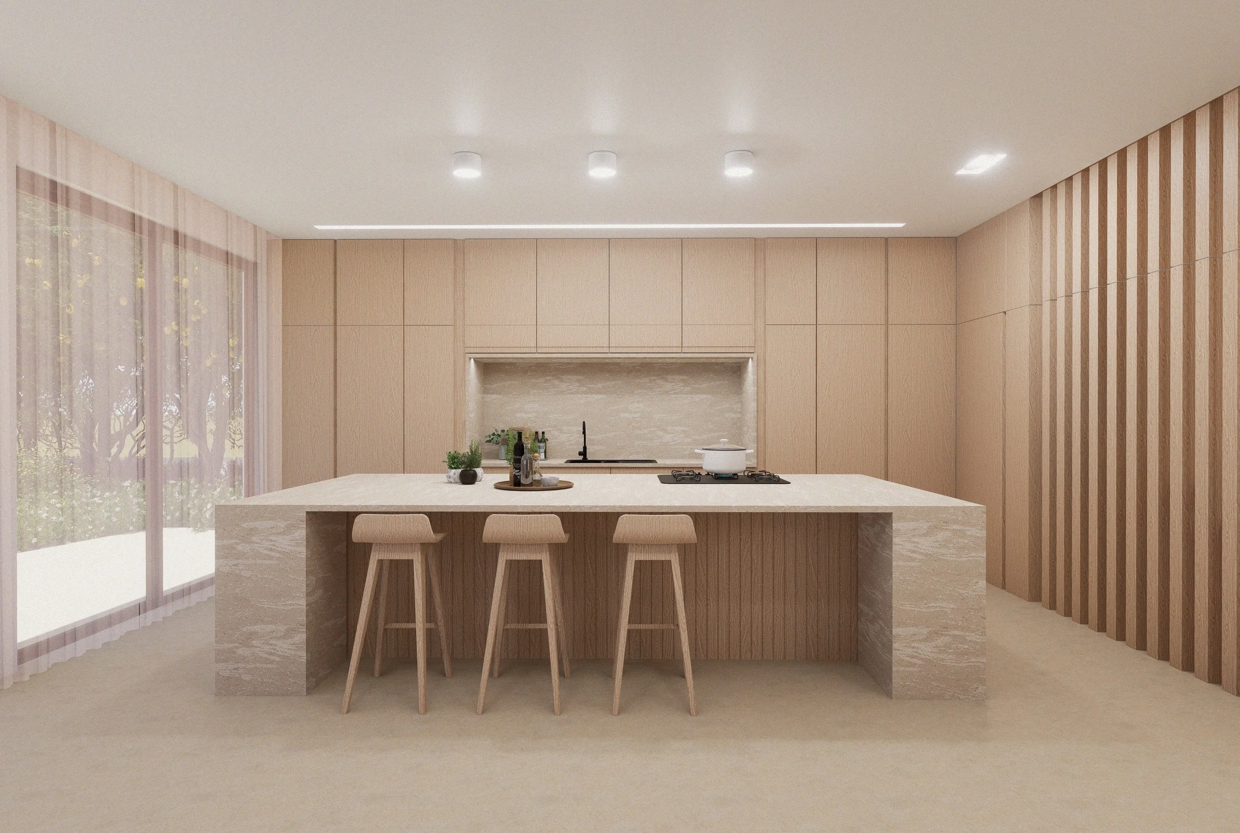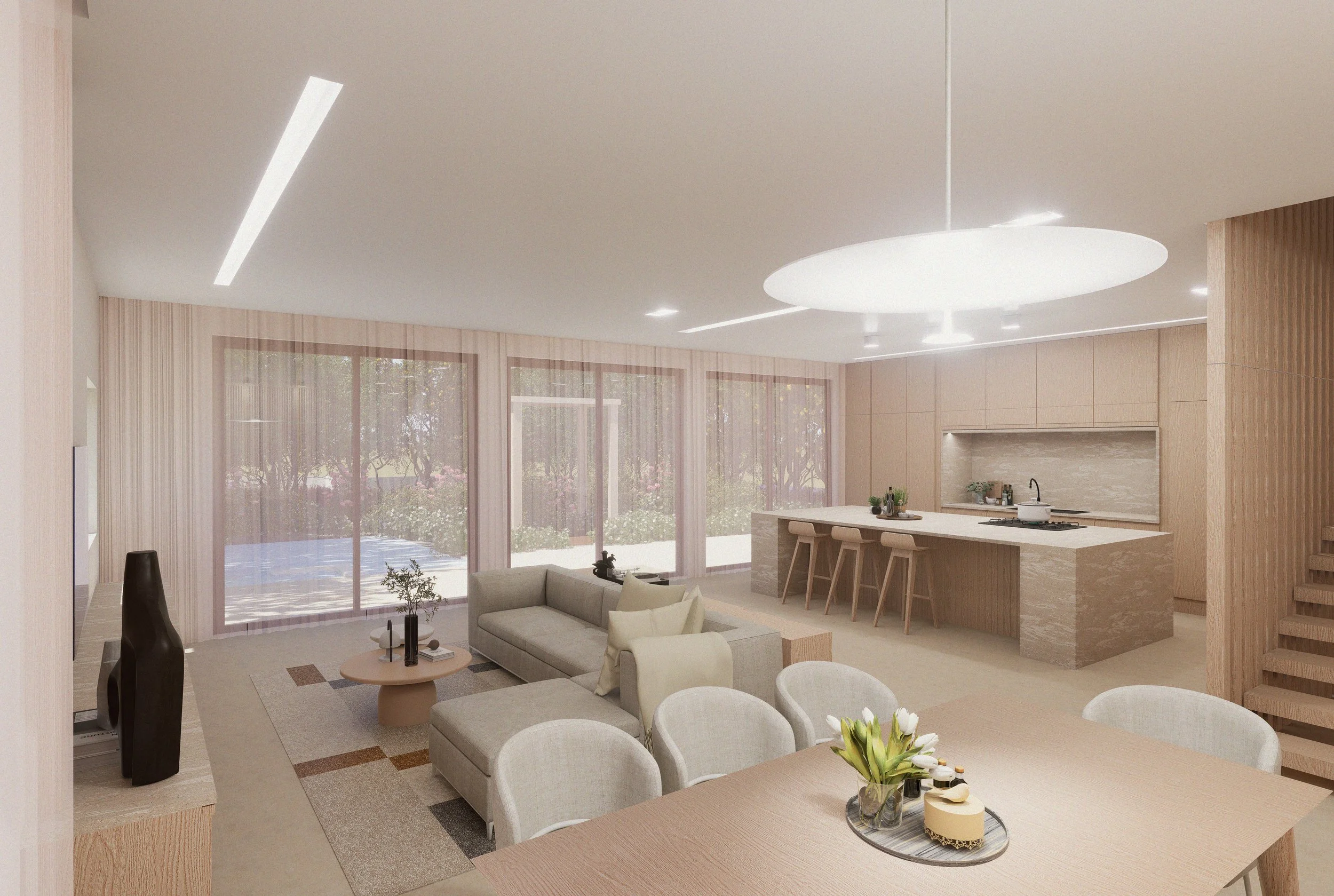 Muted neutrals and soft textures define this serene living and kitchen area. Floor-to-ceiling glazing frames views of the garden, blurring the line between inside and out. A low-profile stone island anchors the open-plan kitchen, while understated furnishings and tactile upholstery foster a calm, tranquil environment for daily life.